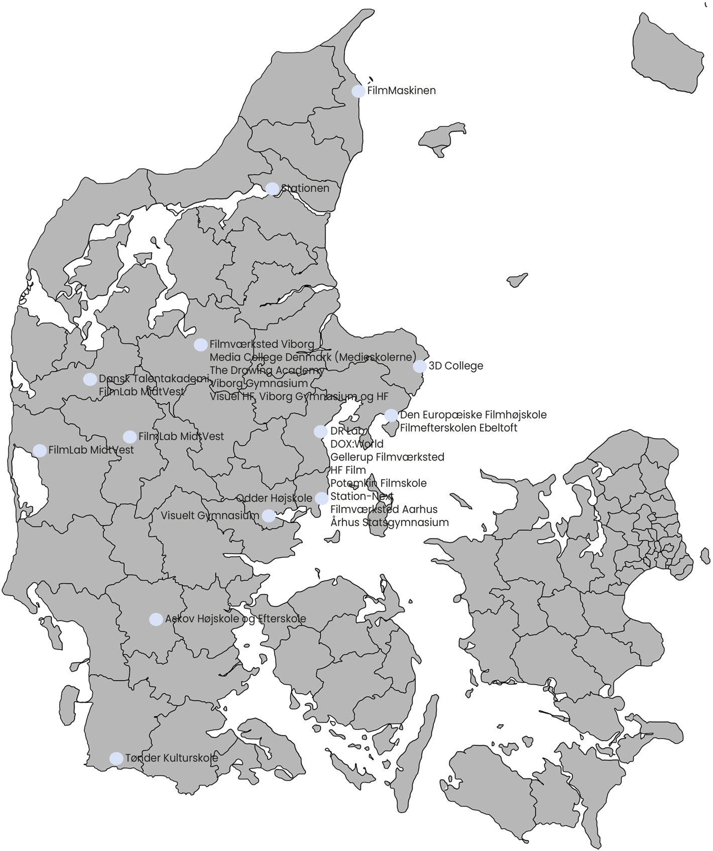 Du er måske 15-25 år og har allerede nogen erfaring med at lave film – kortfilm, fiktion, dokumentar, reklame, animation eller andet. Kig på kortet herunder for at finde en skole, et værksted eller en aktivitet, der kan gøre dig bedre til dét, du interesserer dig for.