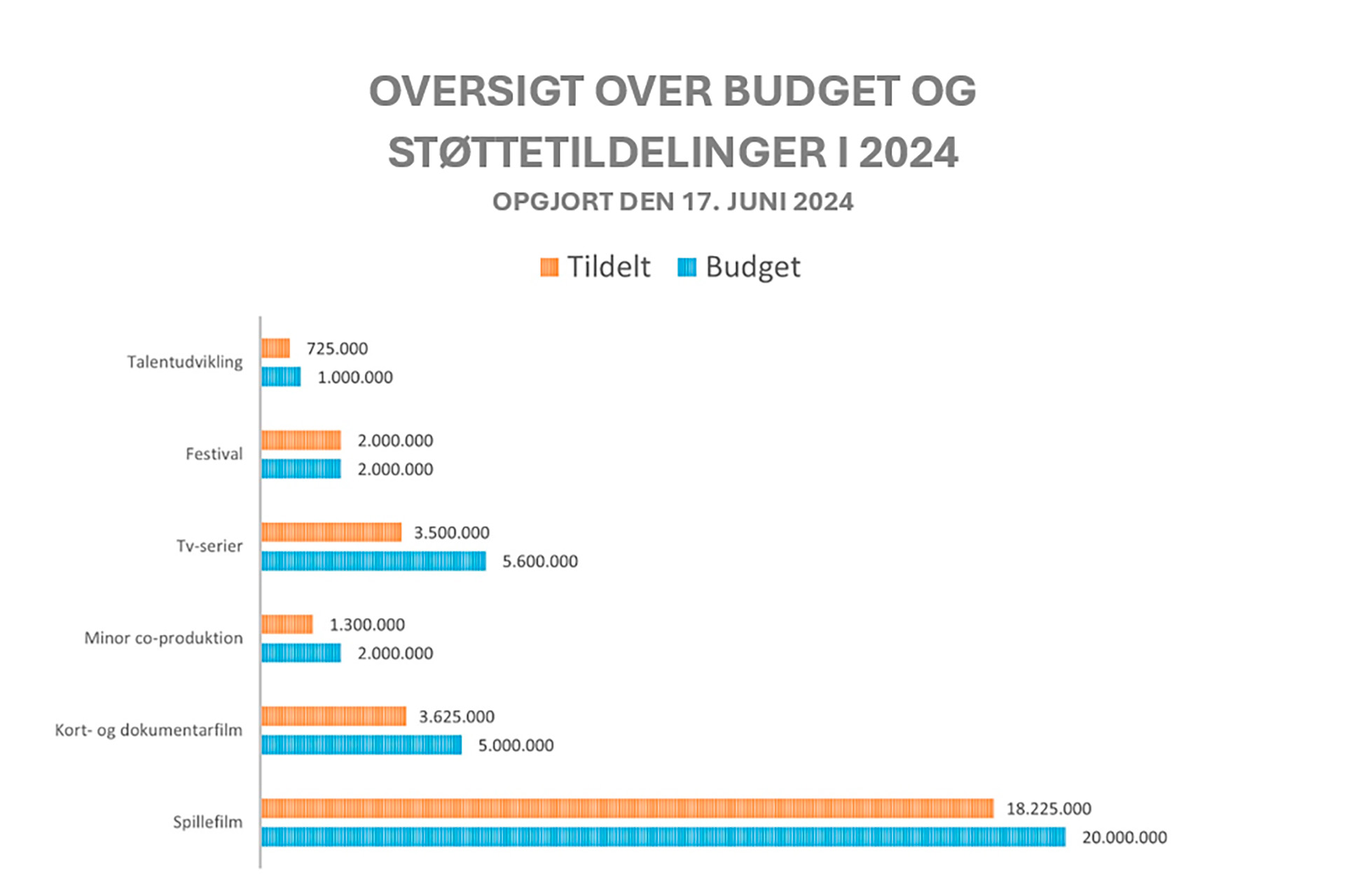 Oversigten kan ses herunder med angivelse af årets budgetramme og tildelt støtte pr. juni 2024.
